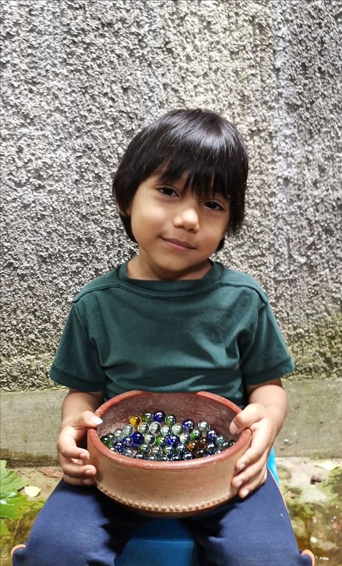 Cada obra es una pequeña instalación de medidas variables, espejismo (el del niño con una cerámica huetar original llenas de bolitas de vidrio). ¡No se las lleven! (el niño estirando sus brazos para que no se las lleven en barcos los tesoros precolombinos).